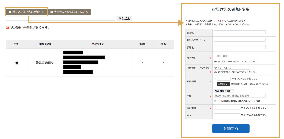 各画面のオレンジ色のボタンから次の手続きに進みます。 お届け先の指定 登録済みのお届け先から今回ご注文の配送先を選択してください。
