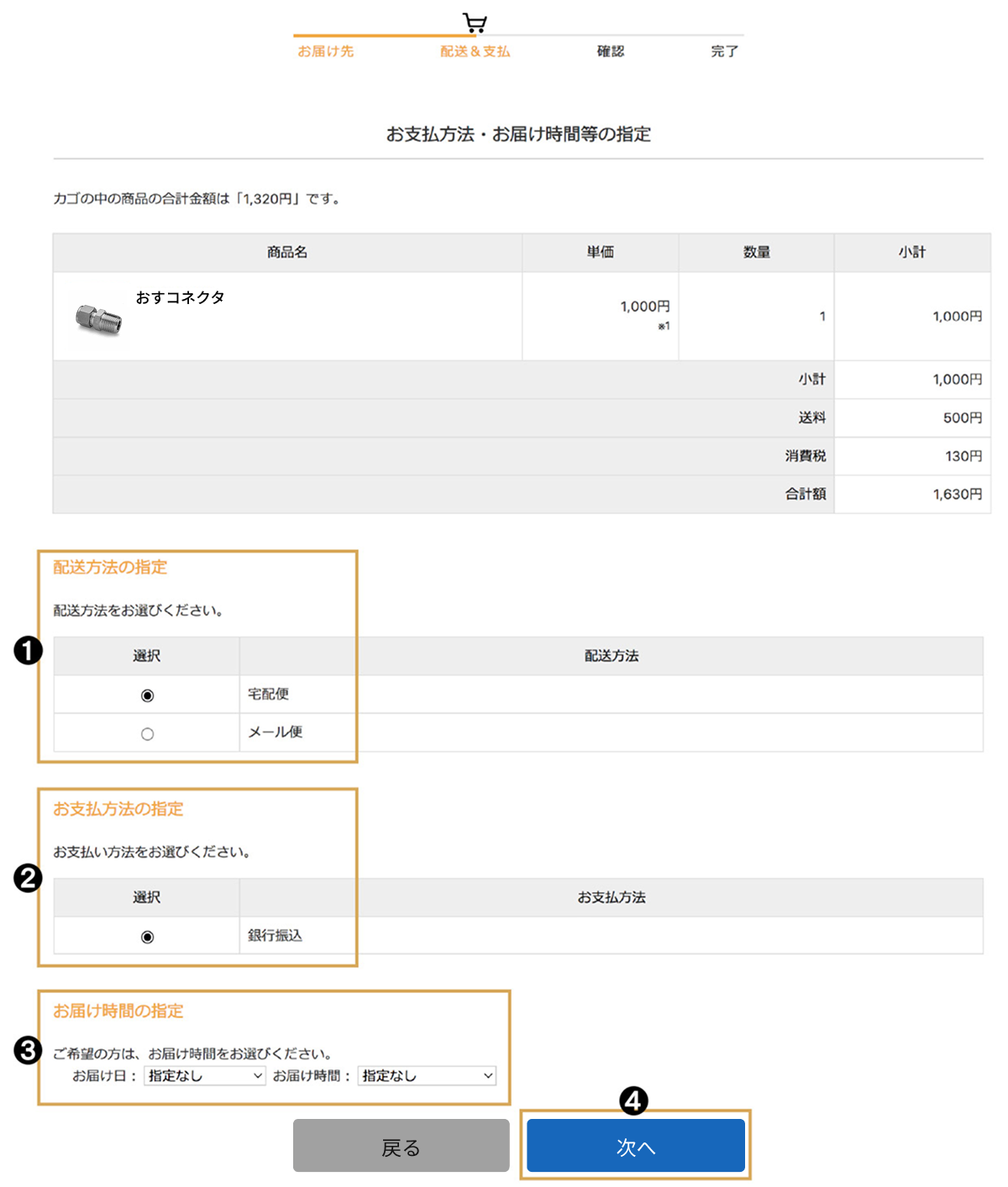※新たなお届け先を選択する場合は「+別のお届け先に送る」からお届け先情報をご登録ください。 お支払方法・お届け時間等の指定 配送方法、お支払方法、お届け希望日時を選択します。