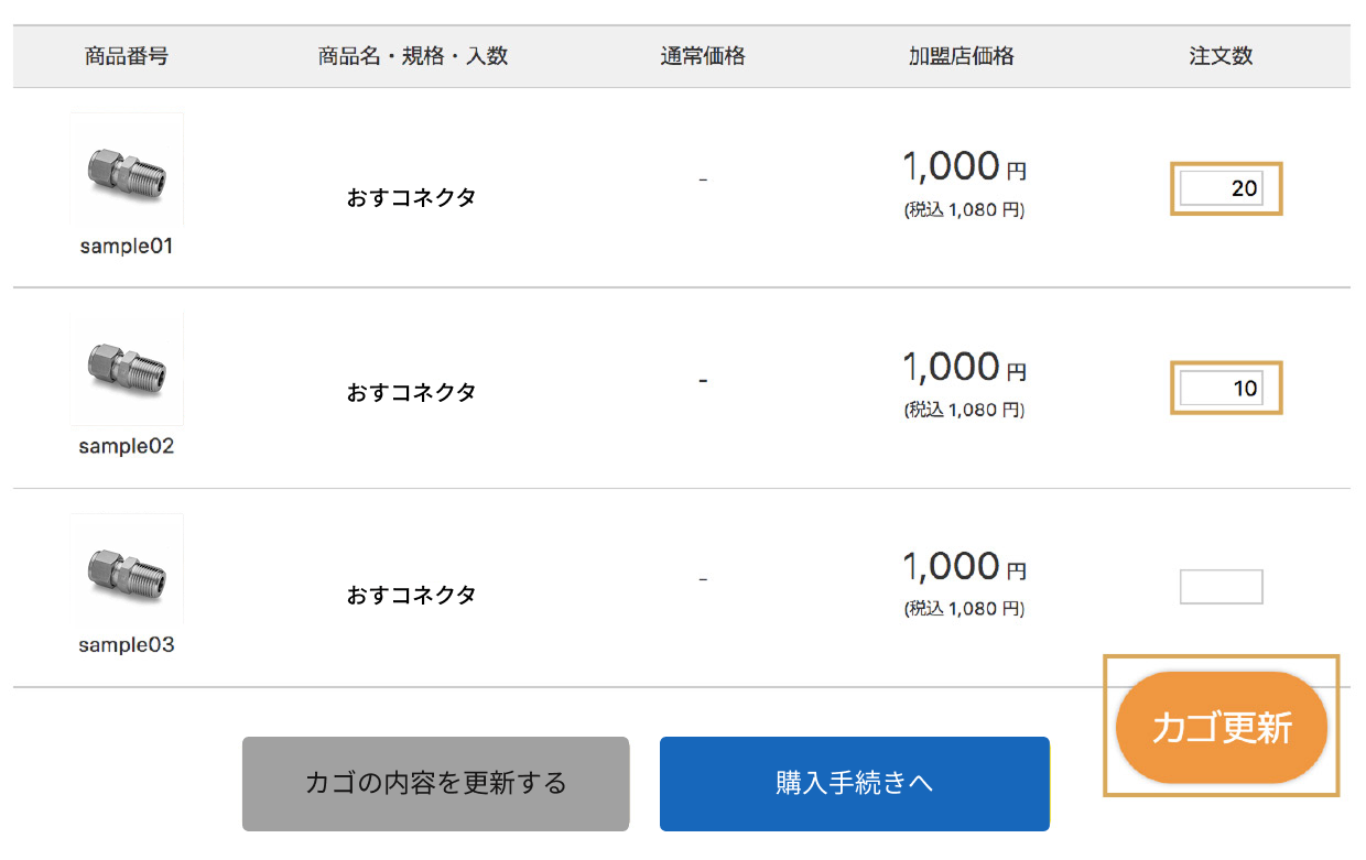 注文数入力の途中でも「カゴ更新」ボタンを押すと、オーダーシートに記入した内容でカートの内容が更新されます。