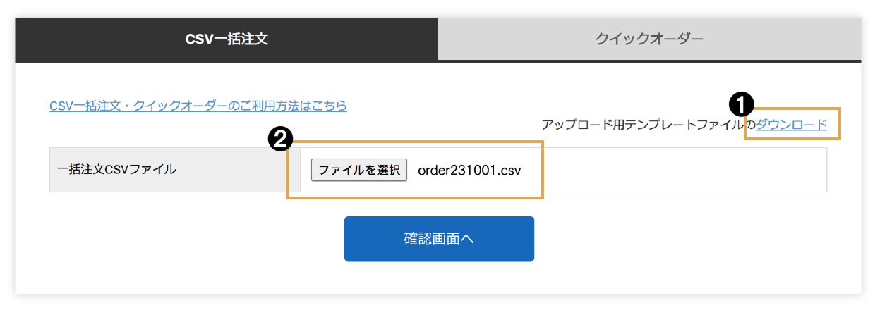 CSVをアップロード ❷ ダウンロードしたCSVを選択し、一括注文CSVファイルからアップロードします。