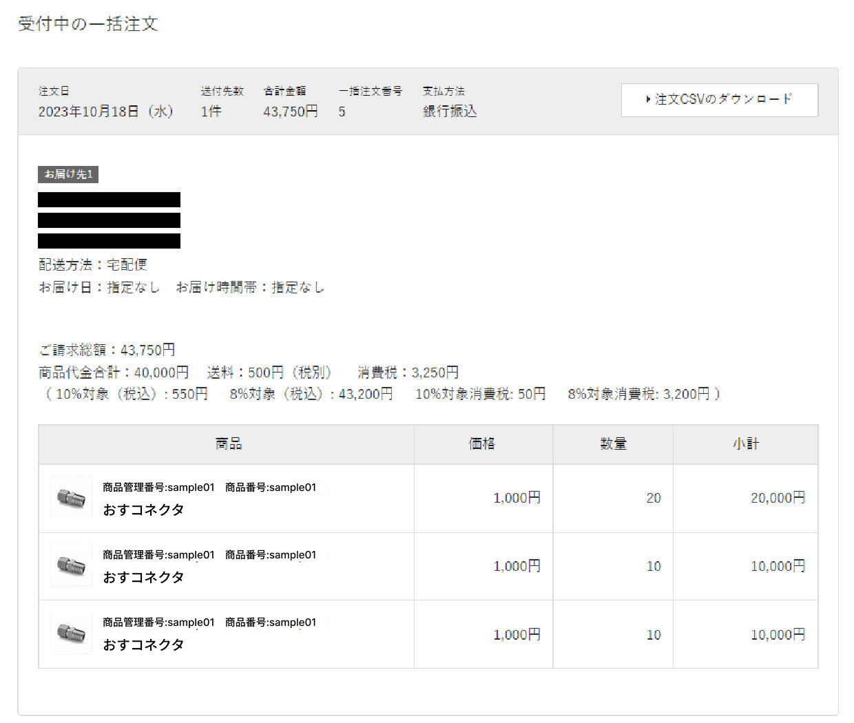 - 注文が完了すると、一括注文CSVアップロード画面で「受付中の一括注文」に表示されます。
