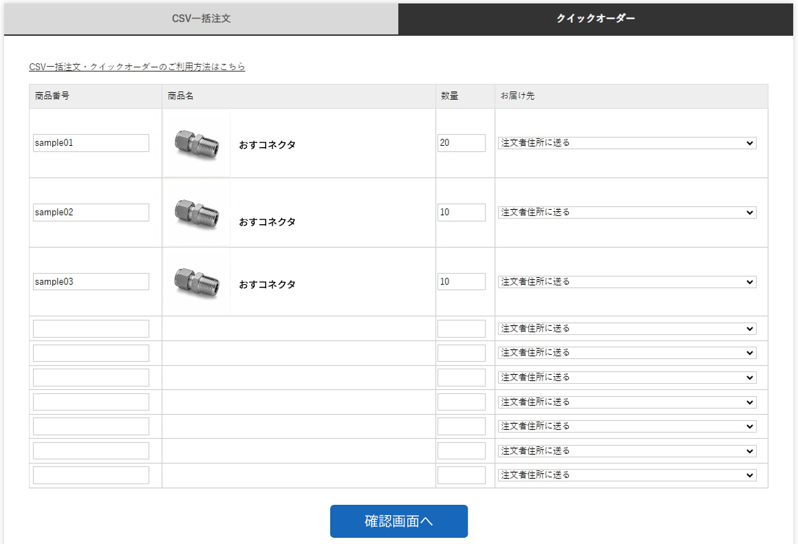 - マイページメニュー内の「クイックオーダー」からCSV一括注文画面を表示します。